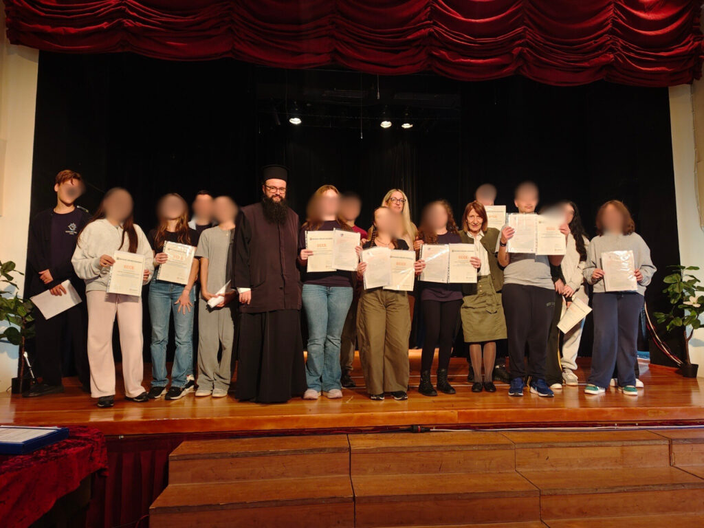 Την Τρίτη 4 Νοεμβρίου 2025 πραγματοποιήθηκε η απονομή των πιστοποιήσεων Cambridge και Michigan στους μαθητές και τις μαθήτριες των Εκπαιδευτηρίων μας. Την εκδήλωση τίμησε με την παρουσία της η επίσημη εκπρόσωπος του Βρετανικού Συμβουλίου Κα Βικη Πλακωτάρη, η οποία απένειμε τα διπλώματα και συνεχάρη τους μαθητές μας για την επιτυχία τους. Στην τελετή παρευρέθηκαν ο Κος Δημήτρης Αλφιέρης, εκπρόσωπος της Ιεράς Μητροπόλεως στα Εκπαιδευτήριά μας, ο Πνευματικός Σύμβουλος Πρωτοπρεσβύτερος Νικόλαος Βουρλάκος, και ο Λυκειάρχης Γιώργος Τσοχατζής.
