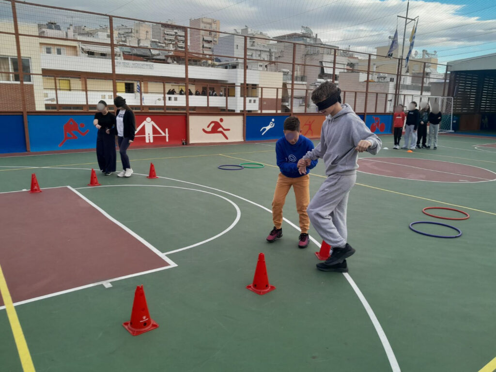 Στο πλαίσιο του μαθήματος Φυσικής Αγωγής και με αφορμή την Παγκόσμια Ημέρα Αναπηρίας οι μαθητές της Β γυμν. επιδόθηκαν σε βιωματικά παιχνίδια για να κατανοήσουν τις δυσκολίες στην όραση με κλειστά μάτια.